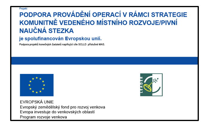 V rámci projektu Pivní naučné stezky bylo spolufinancováno: 20 ks informačních tabulí, 15 ks laviček, 20ks odpadkových košů.